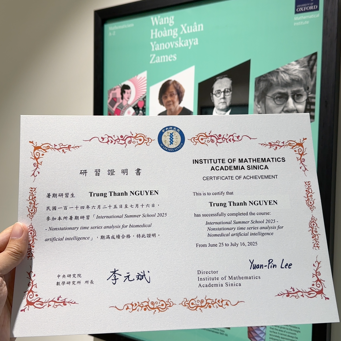 At the end of the program, I received a Certificate of Achievement from Academia Sinica, recognizing the successful completion of the course. This certification represents not only participation, but also deep engagement with advanced topics in mathematical modeling and biomedical AI.